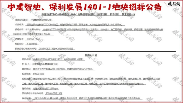 一天后,保利发展旗下的子公司,亦对1401-1地块发出招标公告。涉及基础工程等逾10项内容,估算6亿元。